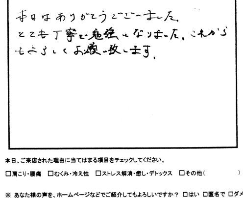 私自身もマッサージをする仕事ですが、先生の幅広い知識から 実際の施術まで、おどろかされ またとてもお勉強になっています。 日常生活の改善から、昔から気になっていた体のクセから体型の悩み まで何も言わなくても言って下さることにも感動しました。 そ…